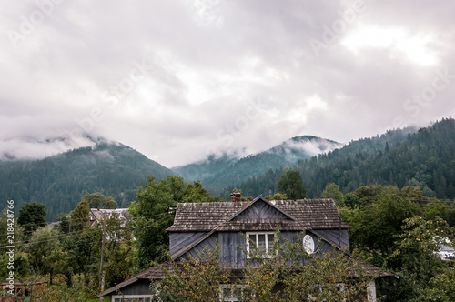 mountain valley with tall trees after a rain on a summer