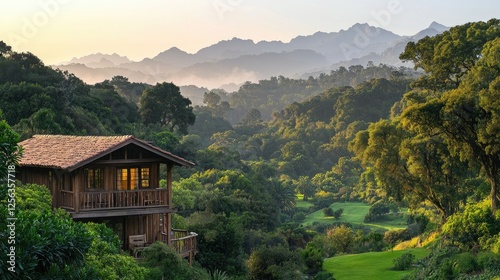cabin, mountain, vale, green, tree, lush, foliage, wood, house, hill, landscape, nature, scenic, view, sunset, sunrise, gold, light, tranquil, serene, peaceful, calm, remote, secluded, escape, wilderness, forest, jungle, tropical, exotic, paradise, picturesque, beautiful, amazing, stunning, vibrant, home, building, architecture, design, property, countryside