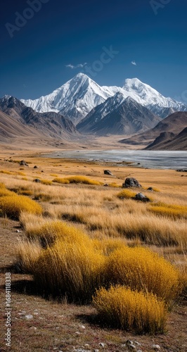 mountain, peak, snow, landscape, vale, grass, gold, autumn, desert, dry, nature, sky, clear, sunlight, bright, huge, serenity, majestic, rocky, terrain, panorama, travel, adventure, exploration, wild, view, expansive, elevation, high, alpine, meadow, water, river, stream, plant, vegetation, dried, colours, texture, distant, tranquil, whimsical, beauty, stunning