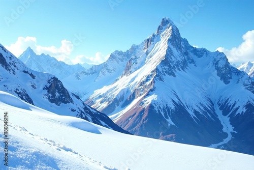 Mountainous landscape with snow-capped peaks and blue sky, frozen, snowy