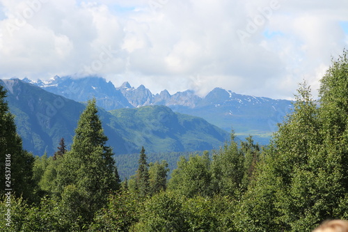 landscape, mountain, mountain, forest, nature, sky, tree, snow, view, green, blue, cloud, peak, travel, tree, alps, vale, summer, grass, rock, hill, pine, cloud, park, landscape, alaska, wilderness