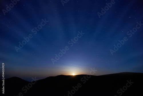 Mountains at night with blue dark night sky with many stars. Moon rising