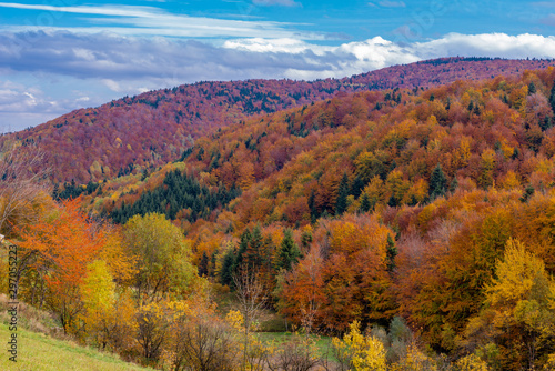 autumn, fall, landscape, nature, forest, mountain, tree, mountain, tree, sky, yellow, season, colourful, colours, red, orange, foliage, hill, green, beautiful, wood, travel, vale, panorama, view