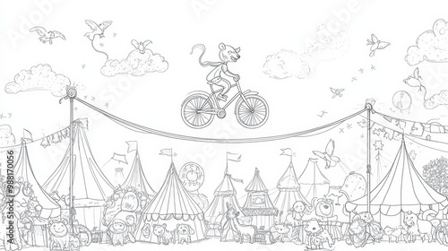mouse, bicycle, circus, tightrope, tent, animal, black, white, illustration, background, colourful, riding, up high, drawing, vignetting, cartoon, graphic, design, art, fantasy, fun, entertainment, performance, joy, magic, wonder, smile, happy, cute, adorable, whimsical, creative, imagination, childhood, dream, adventure, playful