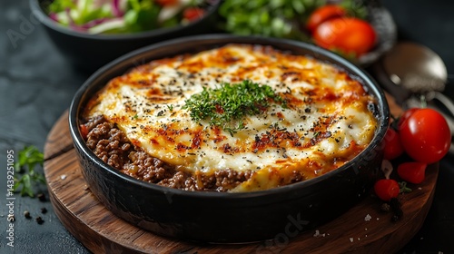Moussaka With Creamy Béchamel Sauce, Layers Of Eggplant, Ground Beef, And Tomatoes, Served With A Side Salad, Styled For Mediterranean Restaurant