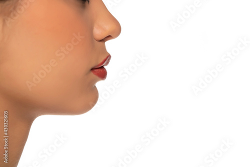 beauty, profile, nose, chin, mouth, female, healthy, adult, young, woman, face, skin, pretty, skincare, lipstick, lip, lip, make-up, feminine, neck, white, isolated, caucasian, surgery, attractive, plastic