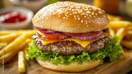 burger, food, hamburger, fries, fresh, delicious, meal, fast, lunch, dinner, classic, sesame, bun, cheese, tomatoes, onion, lettuce, grilled, patty, beef, american, eatery, cookery, tasty, snack, closeup, eat, ingredient, wooden, board, epicure, nobody, deliciously, diet, unhealthy, bread, fat, nourishment, single, object