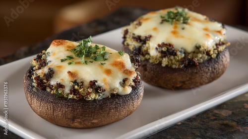 Mouthwatering Grilled Portobello Mushroom Caps Stuffed with Quinoa and Melted Cheese, Garnished with Fresh Parsley