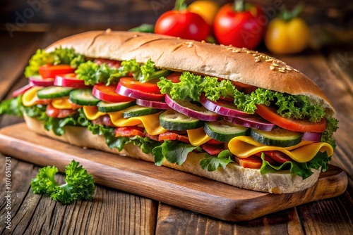 Mouthwatering Long Sub Sandwich with Layers of Fresh Meat, Cheese, and Colorful Vegetables Perfectly Presented in the Rule of Thirds for Culinary Photography Enthusiasts