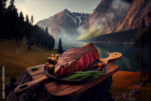 Mouth-watering Piece of Meat Cooked on the Grill. AI Generated