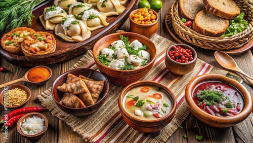 Mouthwatering Traditional Lithuanian Cuisine, Featuring A Rich Display Of Dumplings, Rye Bread, Pickled Vegetables, And Hearty Soups, Encircled By Woven Linens And Wooden Utensils.