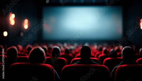 cinema, theatre, audience, motion picture, film, seat, red, dark, light, screen, viewing, silent, people, watching, enjoyment, entertainment, evening, night, blurry, focused, horizontal, vertical, composition, perspective, back, silhouette, empty, filled, darkness, lighting, illumination, shadow, comfortable, relaxation, spectator, attentive, life events, contemporary, design, architecture, large, modern, image, picture, still, showing