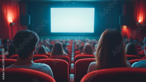 Movie theater screen with audience. Movie theater auditorium with screen and red seats. Leisure entertainment movies and people concept