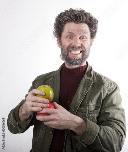 Mr. IceMan, smiling man with a beard, beard covered with hoarfrost, man holding apples, he stares at them. fashion man in knitted sweater and jacket.