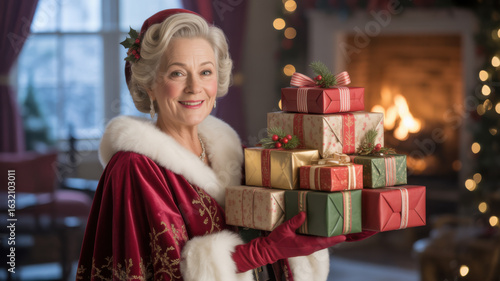 Mrs. Claus Holding Stack of Gifts by Fireplace Holiday Season Greeting Card Portrait