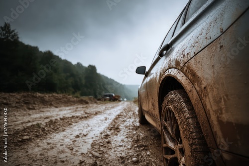 Mud-Covered Car Rear View on Off-Road Rainy Day