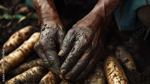 agriculture, dirtied, cultivation, hand, planting, farming, nourishment, labor, root, produce, harvesting, toil, resilience, rural, vegetable, organic, gardening, muddy, dirt, food, farm, determination, community, gloved, persistence, growth, earth, texture, ground, culture, natural, strength, hard, lifestyle, brown, grit, work, dark, weathered, crop, closeup, tradition, detail, effort, rough