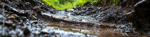 mud, water, stream, rock, stone, dirtied, bank, grooved, wet, dark, brown, green, vegetation, plant, closeup, nature, ground, texture, rough, flowing, pathway, trail, natural, landscape