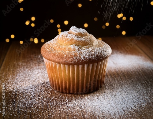 muffin or cupcake with powdered sugar on table and top of cupcake