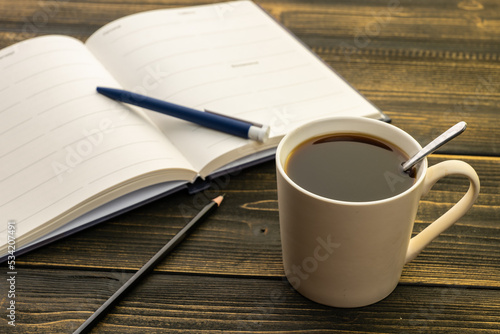mug of coffee on the table next to the diary with a pen and pencil in the morning