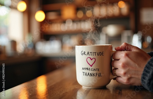 Mug of gratitude resting on a cozy cafe counter with warm light and steam