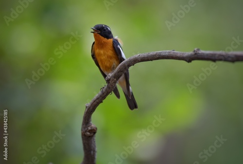 Mugimaki Flycatcher The upper body head is black. Behind the eyes are short white eyebrows-like stripes, large white wings, the neck, chest and belly above dark orange. Vachirabenjatat Park, Thailand.