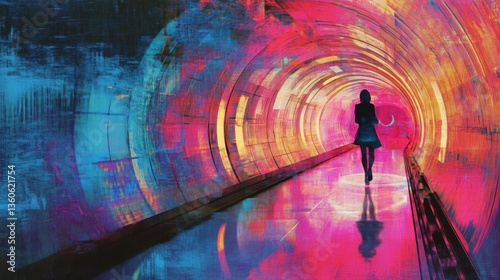 woman, by foot, tunnel, coloration, makeover, design, travel, ecosystem, illustration, emotional, weird, style, background, shape, scene, walk, graphic design, space, adventure, way, hushed, beautiful, futuristic, artistic, vibrant, creativity, shadow, spectacular, flash, modernity, reflex, abstract, colours, lighting, fixing, visual, imagination, solitude, surrealist, plane, shadow, view, transition, art
