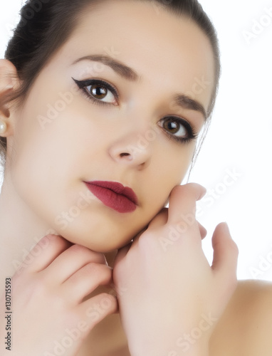 Mujer joven con maquillaje sobre fondo blanco