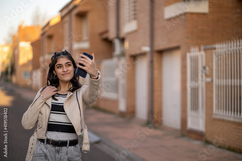 Mujer joven de pelo negro caucásica con camiseta de rayas negras, cazadora beige, se hace un selfie sonriendo con su smartphone