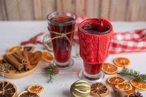 Mulled hot wine with spices with dry fruits in cups on wooden table