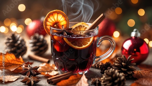 Mulled Wine Featuring Cinnamon, Star Anise, Orange Slice, and Spices