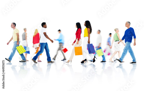 consumer, shopping, walking, people, caucasian, asian, woman, female, casual attire, communication, happiness, large, ethnicity, variation, moving, active, african, crowd, forward, go, isolated, white background, half face, young adult, informal, community, holding, bag, tied-up