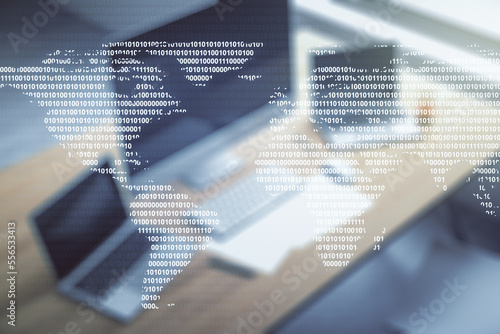 Multi exposure of abstract creative digital world map and modern desktop with computer on background, tourism and traveling concept