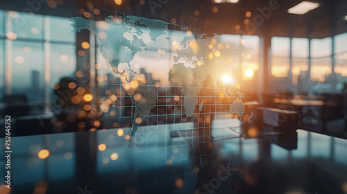Multi exposure of abstract graphic world map hologram on a modern furnished office interior background, connection and communication concept.