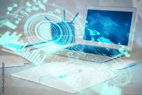 Multi exposure of business theme icons and table with computer background. Concept of success.