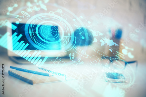 Multi exposure of business theme icons and work space with computer background. Concept of success.