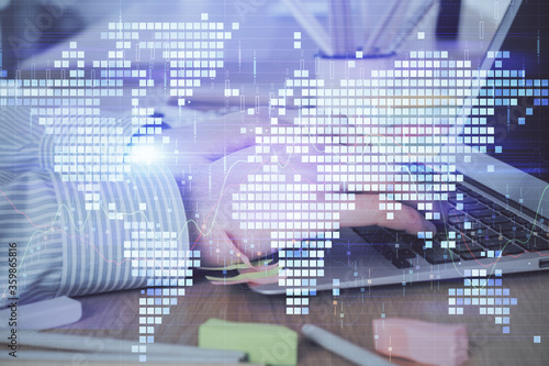 Multi exposure of businessman working on laptop on background. International business hologram in front. Concept of success.