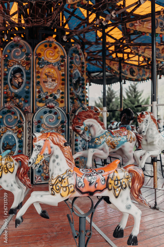 Multi-colored children's carousel with horses marry-go-round at the summer fair. Vertical image.