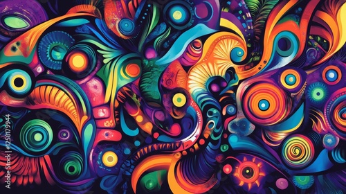 Multicolored psychedelic patterns provide vibrant textures for artistic backgrounds.