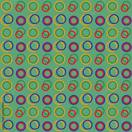 Multicolored seamless pattern on a green background. Bright background. Wrapping paper for gifts. Rings of blue, green, red and orange colors.