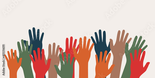 Multicultural and multiethnic people community integration concept with raised human hands. Racial equality of different culture and countries background. Vector Illustration EPS10