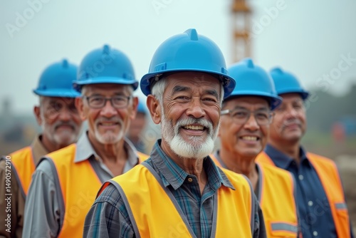 Multicultural Senior Engineering Team at Construction Site: Panoramic Banner Showing Asian and African Elders in Blue Safety Helmets