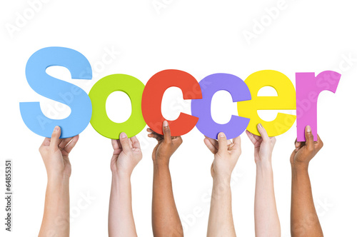 Multiethnic Arms Raised Holding Text Soccer