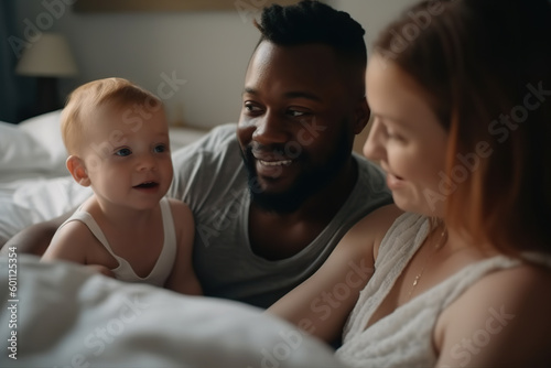 multiethnic family laying in bed with their newborn baby. Generative AI