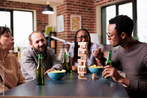Multiethnic group of friends sitting at table in living room while playing together society games. Diverse people sitting at home while enjoying party game with wooden blocks and tower structure.