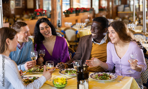 Multiethnic group of positive men and women sitting at table in restaurant, laughing and drinking wine.