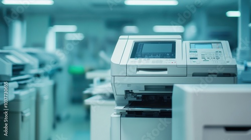 printer, office, technology, copier, fax, scanner, multifunction, machine, business, document, paper, digital, print, ink, toner, copy, scan, work, productivity, efficiency, modern, device, equipment, hardware, network, connectivity, wireless, automated, industrial, desk, workspace, white, blue, grey, interior, background, futuristic, minimalism, clean, professional