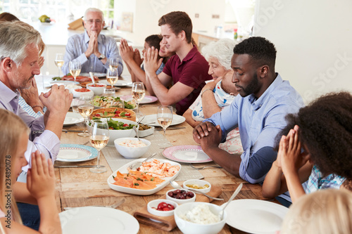 Multi-Generation Family And Friends Around Table Praying Before Meal At Party