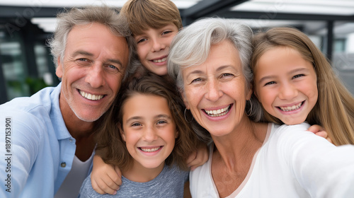 Multi-generational family smiling and embracing while taking joyful outdoor selfie, togetherness happiness celebration, group self-portrait moment, family unity documentation, spon