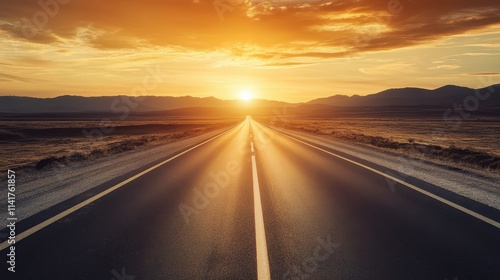 Multilane highway stretching across a desert under a golden sunset, transportation infrastructure and vastness